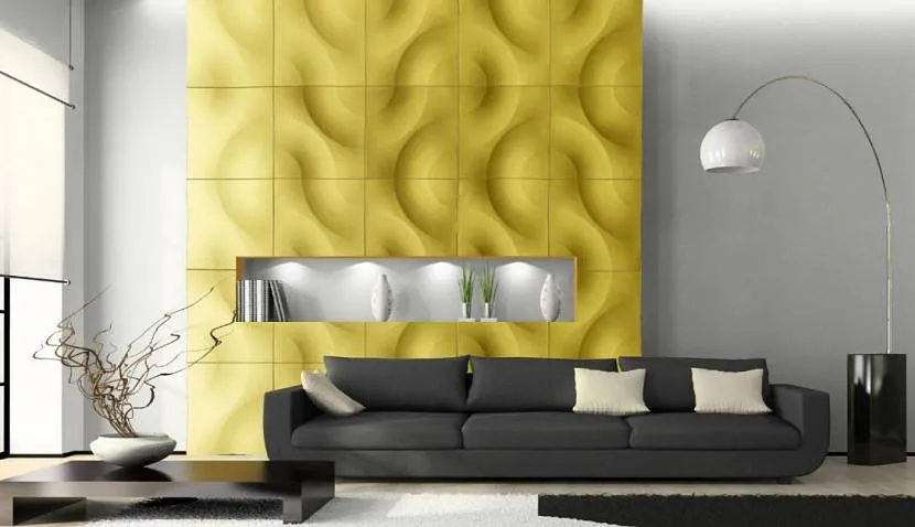 Волнистая жёлтая панель в интерьере гостинойИсточник stroymix67.ru