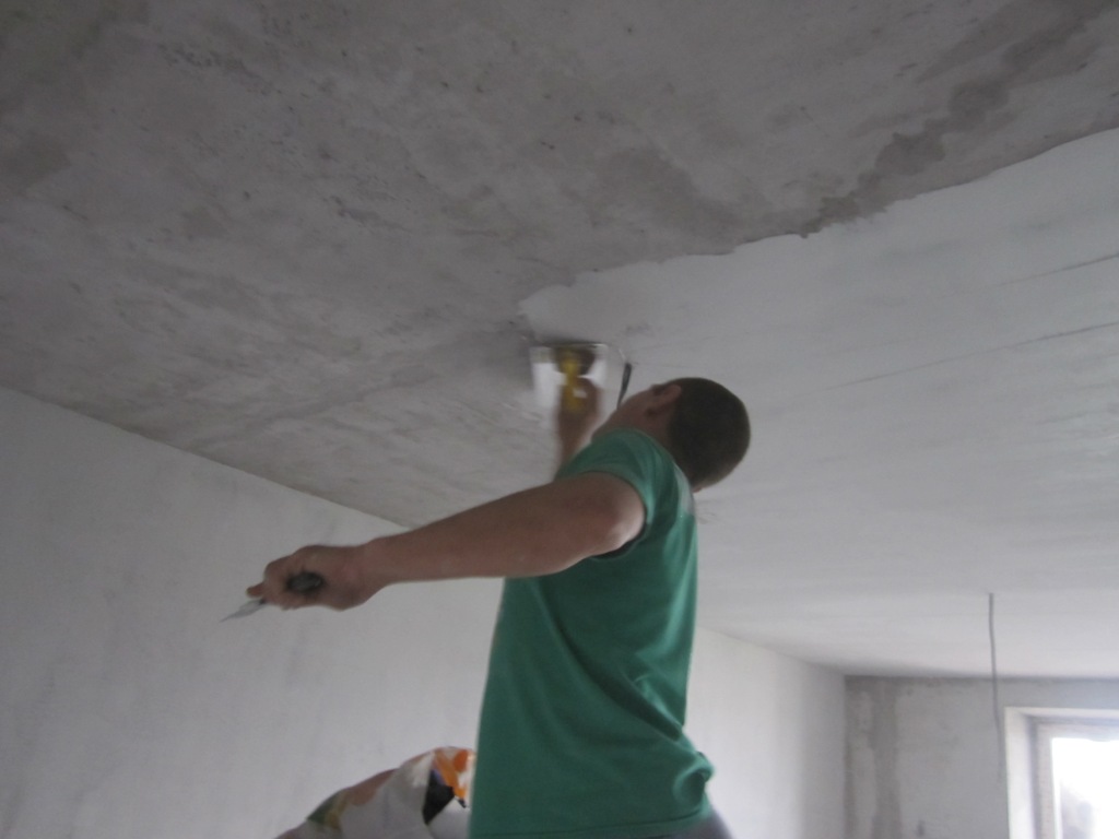 Чтобы покрасить потолок, сведя шанс образования разводов к минимуму, необходимо наносить краску на хорошо подготовленную ровную поверхность. Можно без труда удалить неровности потолка своими руками. Для этого используется шпаклевка. Она наносится шпателем на проблемные места, затем шлифуется шлифовальной сеткой.