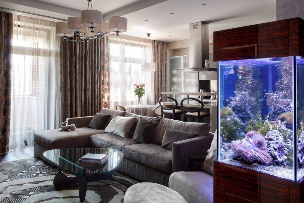 Шикарный аквариум во всю стену в гостиной — это декоративная перегородка отделяет общественную зону от интимной