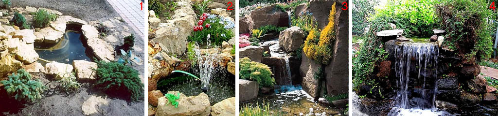 Грустные следствия 2-го порядка – водопадные насосы берут от сети примерно от 350 Вт, а то и все 1,5-2 кВт, которые счетчик будет «мотать» все лето. А воды водопад испаряет в несколько раз больше, чем фонтан с таким же расходом, так что и за водичку на долив водоема придется выложить немало. Емкость же самого водоема должна быть от 3-часовых расходов воды, а его глубина – от 1,5 высот падения каскада, т.е. и пруд под водопад нужен большой, глубокий, дорогой и сложный.