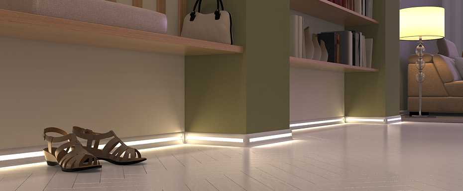В алюминиевом плинтусе со светодиодной подсветкой с лицевой стороны сформована канавка, в которую укладывается светодиодная лента. Закрывается канавка полосой прозрачного или матового пластика. Соответственно, свет получается более яркий или рассеянный. Такие плинтуса дают интересный эффект — стены «парят» в воздухе. Если их установить в коридоре, в ночное время нет необходимости в дополнительном освещении.