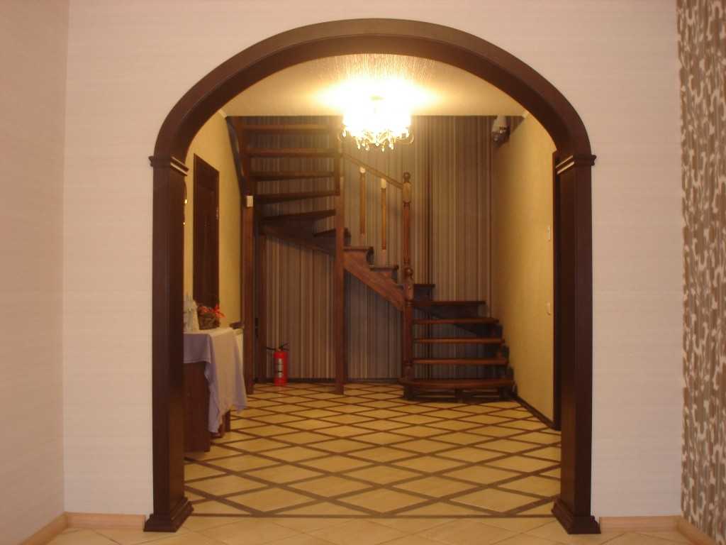 Очень похож на обычный проем, да это по сути он и есть, только без дверного полотна. Для большей оригинальности часто сопровождается деревянными резными элементами в виде колонн по бокам. В таком виде хорош для классических интерьеров, а также этно-стиле — греческом или римском, в зависимости от типа колонн.
