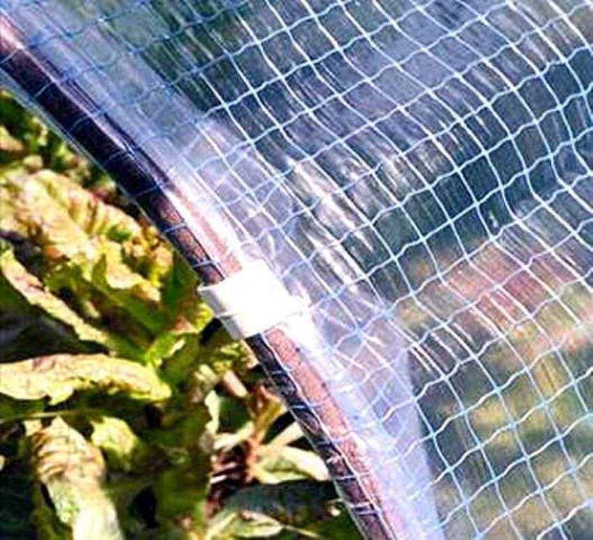Для крепления на пластиковые трубы или специальную арматуру хорошо использовать выпускаемые для этой цели пластиковые зажимы. Если таких не имеется, изготовьте их самостоятельно из труб большего диаметра – это несложно. Каркас теплицы из оцинкованного профиля требует специальных креплений, идущих в комплекте с профилем.
