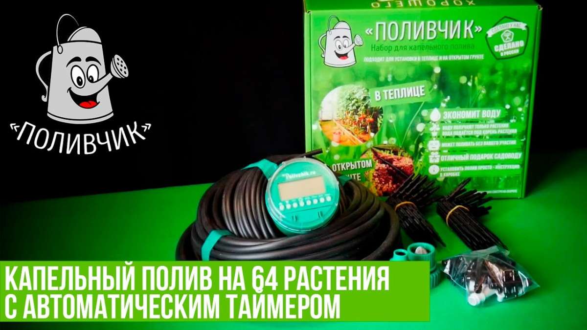 Автоматическая система полива «Поливчик 64» предназначена для автоматической подачи воды в прикорневую зону растений. Полив имеет 64 капельницы, позволяющие поливать 64 растения одновременно. Входящий в набор таймер позволяет запрограммировать 16 программ, которые могут исполняться одновременно, что даёт возможность создавать гибкие настройки полива на неделю. Таймер полива работает от 2 батареек, которых хватает на весь оросительный сезон. Предлагаем сравнить и увидеть отличную продолжительность одного цикла полива — от 1 минуты до 2 часов. Система капельного полива идеально подойдёт для дачников, приезжающих на дачу по выходным.