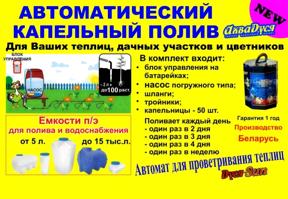 АкваДуся является почти профессиональным устройством. Она работает с установленным самим фермером периодичностью, поставляется всего в одной коробке. Без труда устанавливается в теплице самостоятельно.