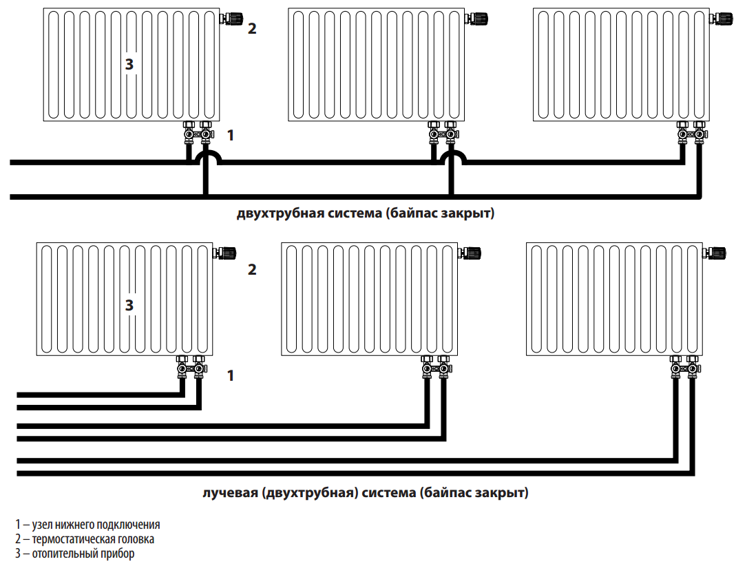 - батарея и байпас должны быть разделены запорным вентилем или терморегулятором.