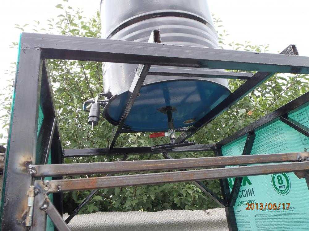 - Если вы используете для воды пластиковый бак, то обязательно усильте сцепление емкости с установочной опорой. Разумнее привязать бак непосредственно к конструкции, иначе во время сильных порывов ветра пустую бочку может снести.