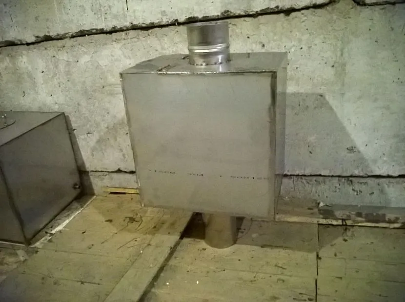 - стыки между емкостью и соединительной трубой заделываются термостойким герметиком – операция предотвращает попадание дыма внутрь парилки;