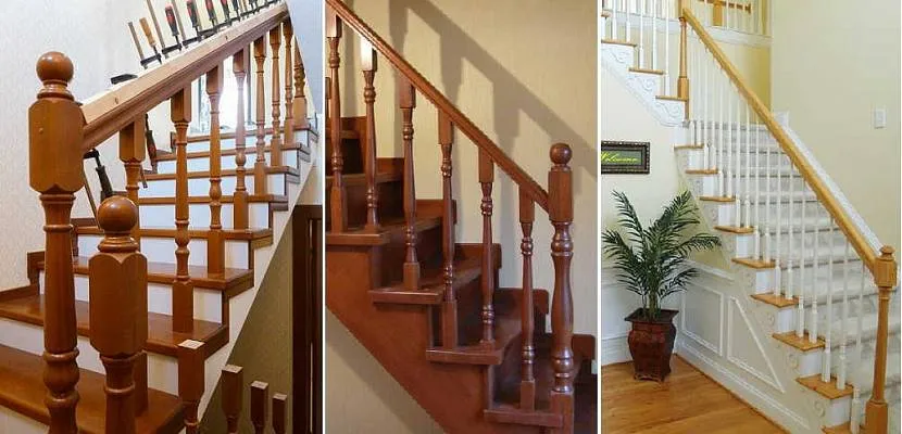 Каждая стойка состоит из центральной части, опоры и торца. Последние два элемента крепятся к лестнице. Существуют несколько типов деревянных балясин: