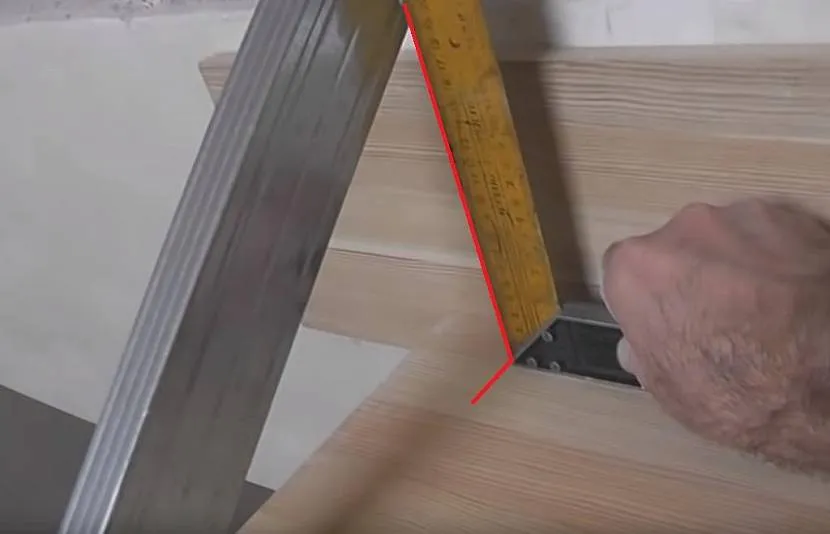 - На ступени переносят прямую. Удобнее всего сделать это при помощи большого угольника и карандаша. На каждой ступени получается есть линия, по которой будем ровнять центры столбов и балясин.