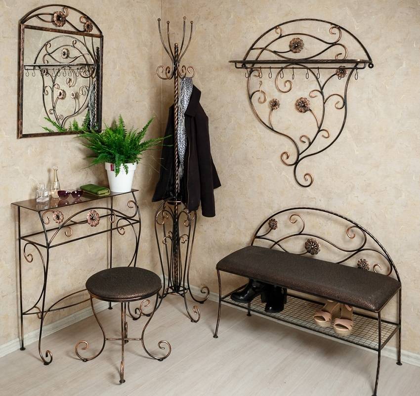 Эффектно выглядят модели с высокими коваными спинками, на которых расположены крючки для одежды. Под сиденьем находится полка для обуви. В верхней части может присутствовать сетчатая антресоль для головных уборов и шарфов.