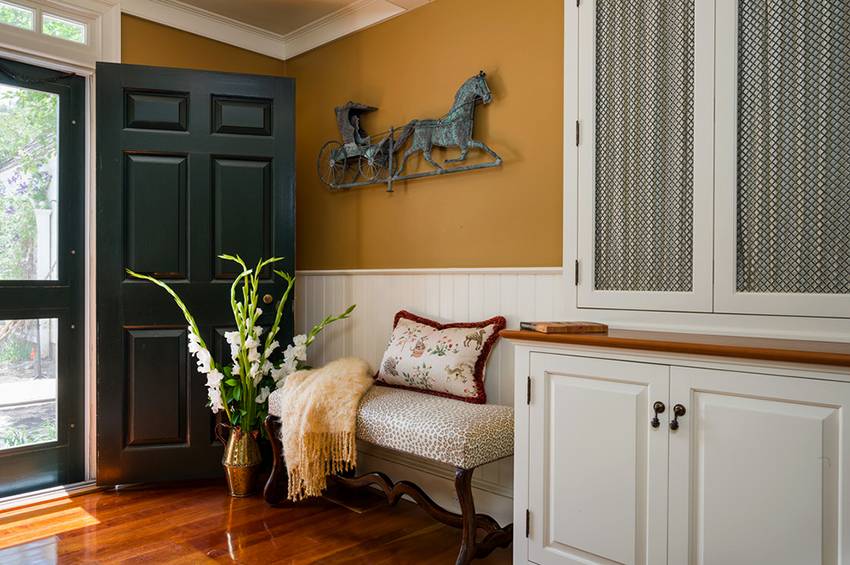 Небольшая банкетка с подушкой для сиденья в прихожей.