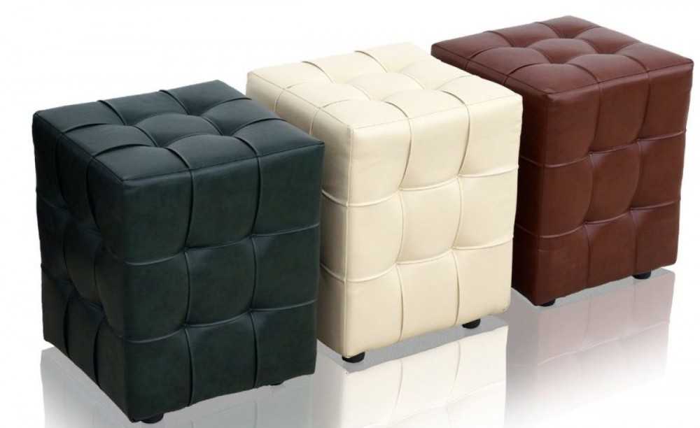 Данный вариант более дешевый по сравнению с предыдущим. Будет смотреться также благородно, как и пуф из натуральной кожи. При этом в уходе кожзаменитель не капризный. Хотя срок службы у него значительно меньше, чем у натурального «собрата».