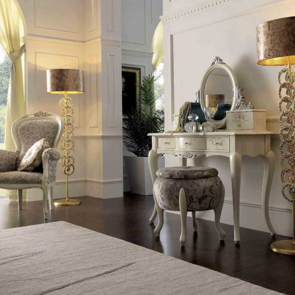Больше подойдет под интерьер в стиле барокко или ампир. Изделие будет иметь кованые, витые основания. Чаще у этих экземпляров нет встроенных полочек, ящиков и шкафчиков. Выполненный в данном стиле пуф будет лучше всего смотреться в прихожей.