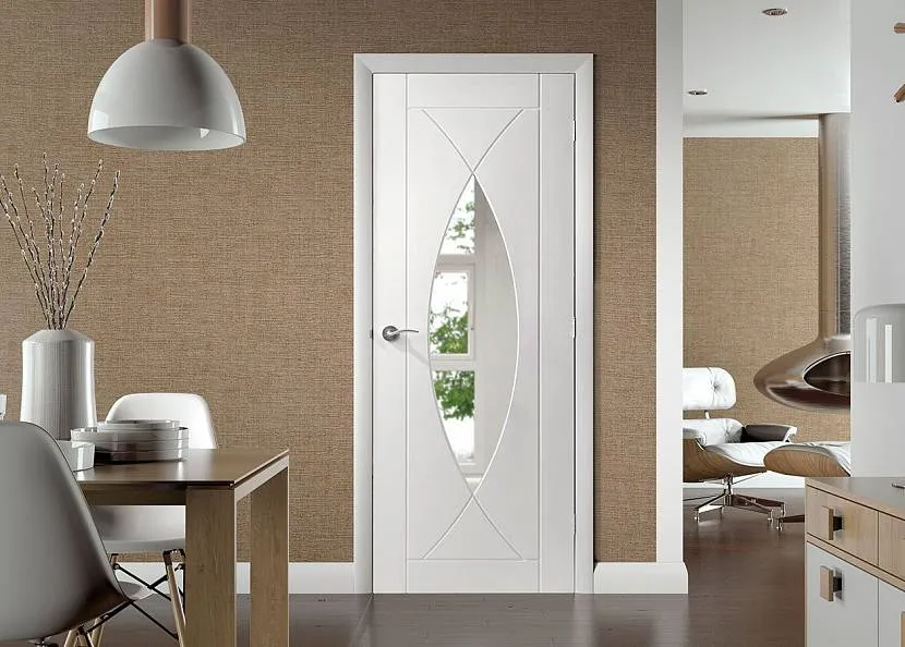 Белые двери в современном стиле могут иметь гладкую или филенчатую поверхность, быть глухими или остекленными. Стеклянные вставки отличаются дизайном формы, размерами и видом стекла: прозрачное или матовое, оно нередко украшается гравировкой.