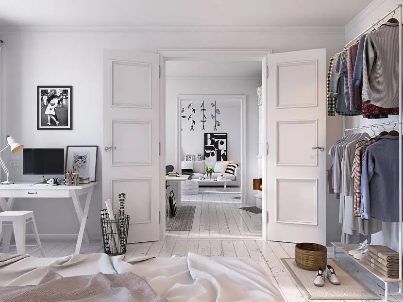 - Если светлую дверь расположить на такой же однотонной стене, то будет достигнут эффект визуального расширения пространства.