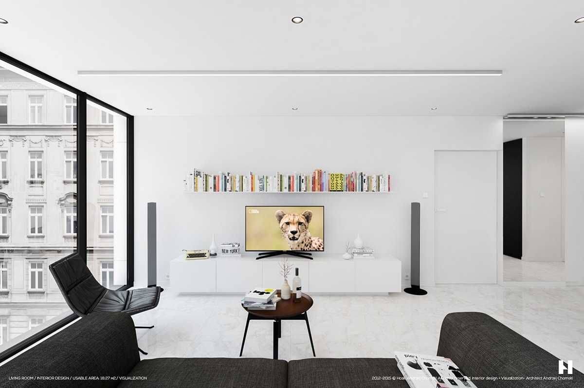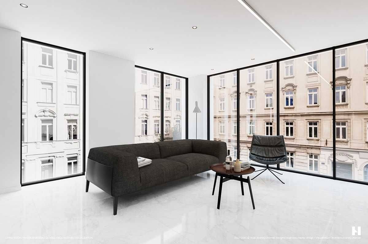 На фото большая современная гостиная в доме, который находится в самом центре Варшавы. Через большие панорамные окна открывается вид на центр города. Благодаря минималистичному оформлению и простейшему цветовому сочетанию (в белый интерьер добавлено незначительное количество чёрного) интерьер не привлекает к себе внимания, а гости могут сосредоточиться на видах из окон.
