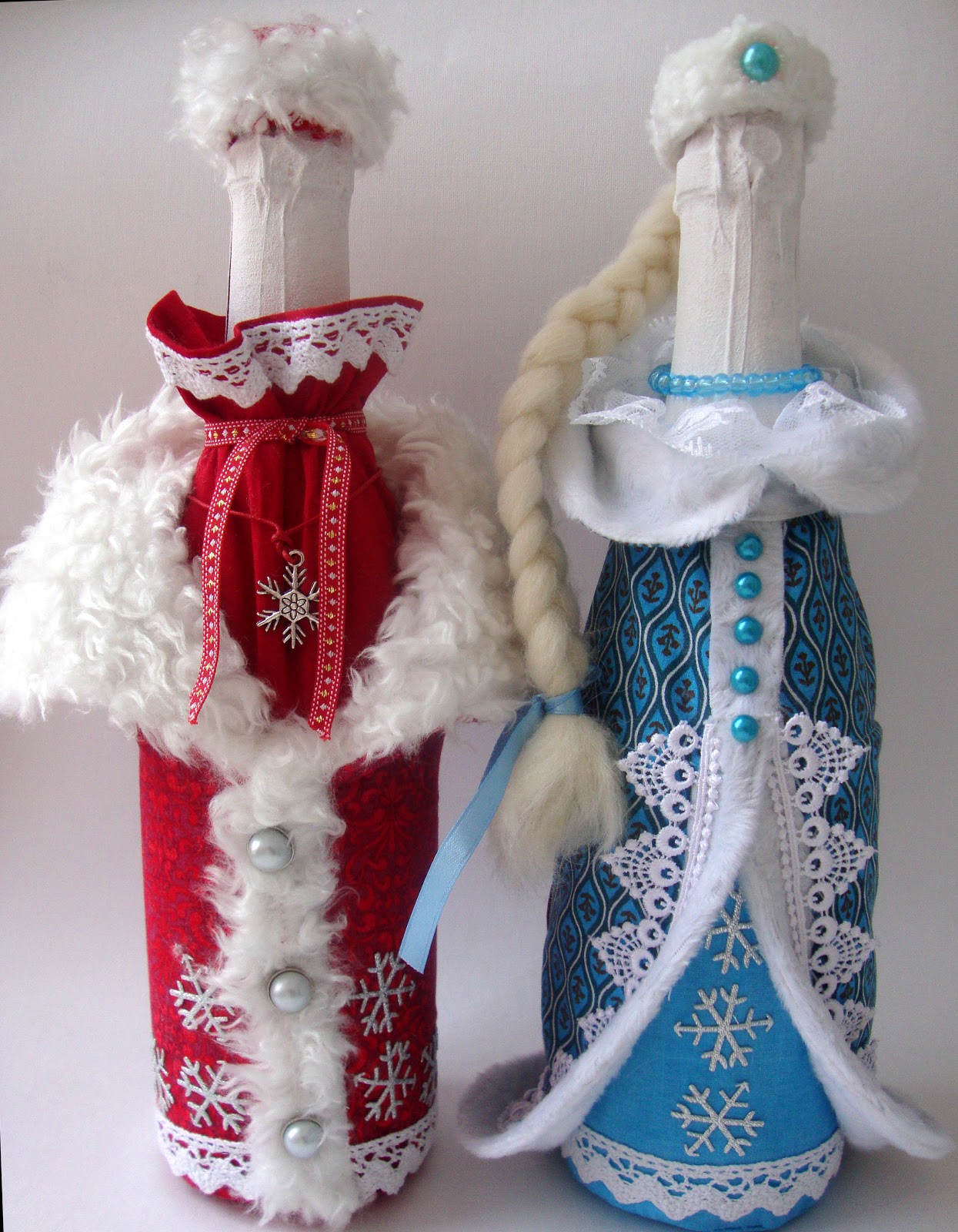 Оригинальное украшение – многоразовые фетровые чехлы в виде Деда Мороза и Снегурочки.