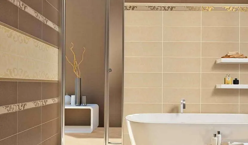 Традиционно для оформления ванной комнаты используют керамическую плитку. Она гигиенична и легка в уходе, к тому же представлена в широком ассортименте. Если взять два разных оттенка бежевого, то можно создать объемный эффект. Уместен будет асимметричный орнамент. Плитку применяют как для стен, так и для пола, на ней не будут заметны следы от воды. Для небольших санузлов используют светлые тона плитки, чтобы зрительно расширить пространство. Затирку желательно использовать не белого цвета, а кремовую.