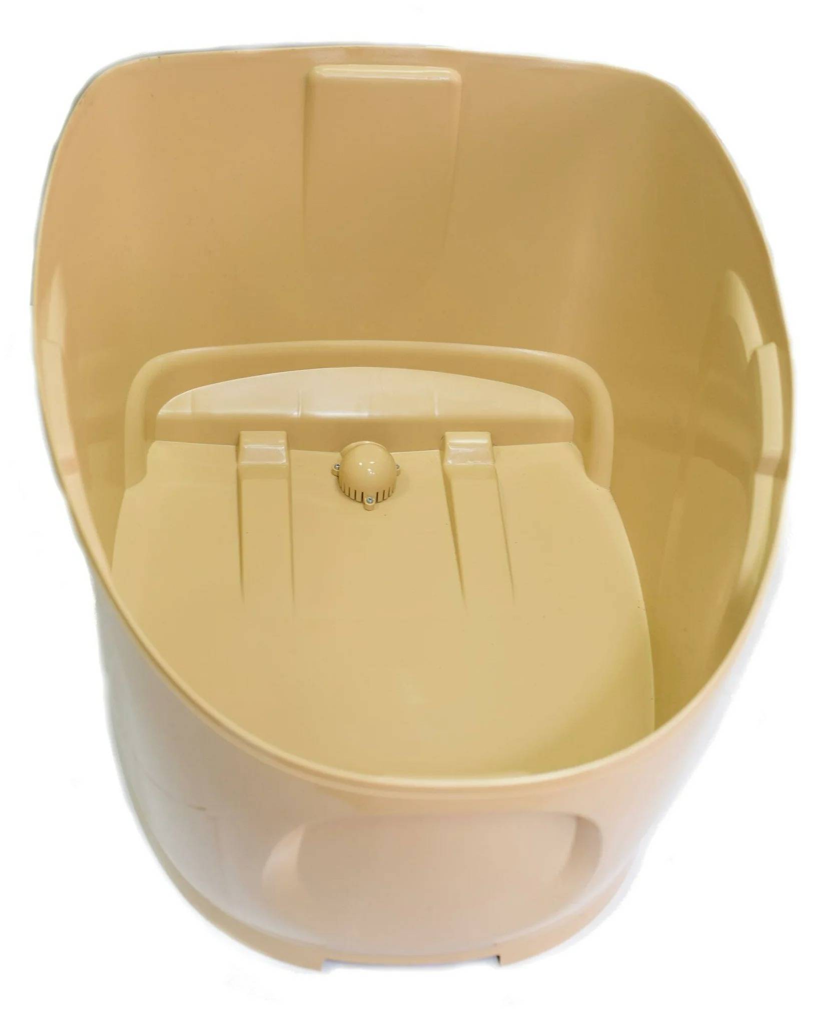 Вместимость накопительного бака составляет 44 литра, чего хватает примерно на полтора месяца для семьи из 3 человек. Для смыва отходов не требуется вода. Роль наполнителя выполняет торф, который засыпается в верхний резервуар объемом 11 литров. Биотуалет легко обслуживается – достаточно снять нижний бак и удалить содержимое.