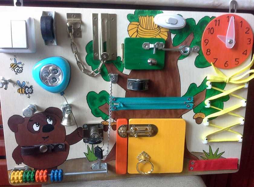 Но важно, чтобы ребенок понимал для чего они нужны. Так, замки должны закрывать и открывать какие-то дверцы, выключатели должны управлять световыми или звуковыми элементами, а застежки, соответственно, должны застегивать