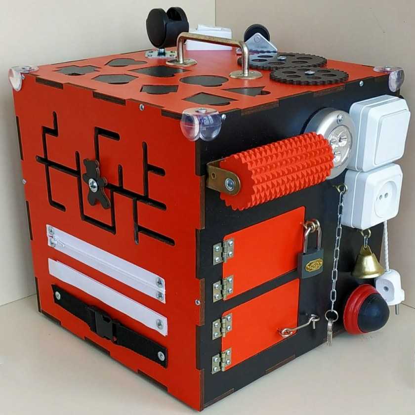 - Бизикуб или бизидом. Это сложная и многофункциональная конструкция, в которой боковые панели могут использоваться с обеих сторон. Конструкция бизикуба основана на использовании 5 сторон (подставки на шестой стороне), что позволяет использовать большее количество развивающих элементов. Каждая сторона может быть выполнена тематически. Для мальчиков это могут быть элементы машин (руль, рычаги, колеса и т.д.), дома (выключатели, шурупы, трубы, крючки). Для девочек стенды могут быть посвящены куклам (банты, расчески, косы из ниток и т.д.), дому (шторы, посуда, цветы и другие предметы). Для мальчиков и девочек можно использовать одинаковые стеллажи, посвященные повседневной жизни (замки для одежды, шнурки, пуговицы, застежки, кнопки), развитию (счет, буквы, цифры) и интересам ребенка.
