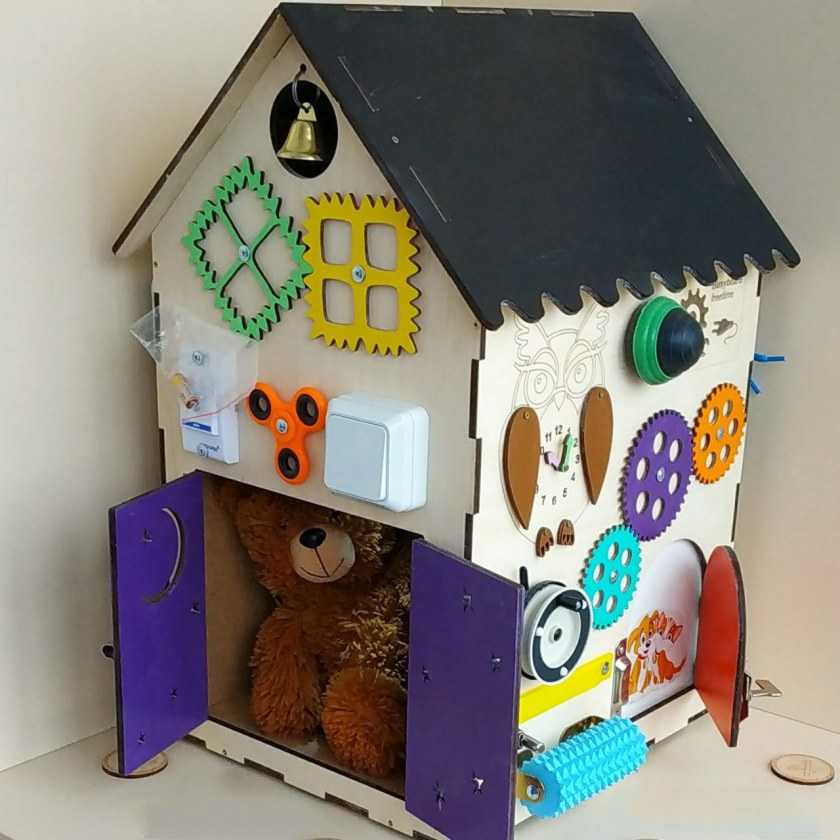 Бизиборд в виде домика подходит для детей старше года. Такая игрушка способствует тренировке логического мышления, мелкой моторики, тактильного восприятия. Для создания подобного предмета придется проявить фантазию, терпение, потратить немало сил. Сделать бизиборд в виде дома можно твердый из дерева, а также мягкий из текстильных материалов.