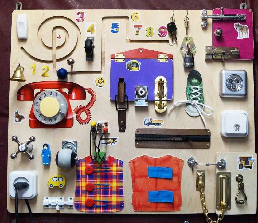 Бизиборд позволяет собрать в одном месте даже запрещенные предметы, функциональность которых ребенок может изучить без риска для здоровья. Это позволяет добавлять наклейки, картинки и т.д. по своему усмотрению.
