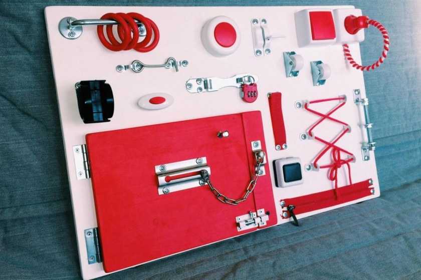 Бизиборд – это игровая доска, которая не просто развивает мелкую моторику, но еще и позволяет с малого возраста ознакомиться с предметами быта, получить навыки самообслуживания. Вот список самых распространенных элементов в бизиборде: