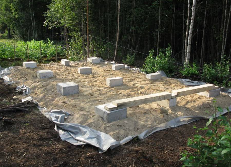 Основа любой стройки – закладка фундамента. Если ваша бытовочка будет временным сооружением, снимите верхний слой плодородной почвы, утрамбуйте землю, постелите геотекстиль. Затем насыпьте слой песка, снова уплотните и установите поверх шлакоблоки в симметричном порядке, как показано на фото.