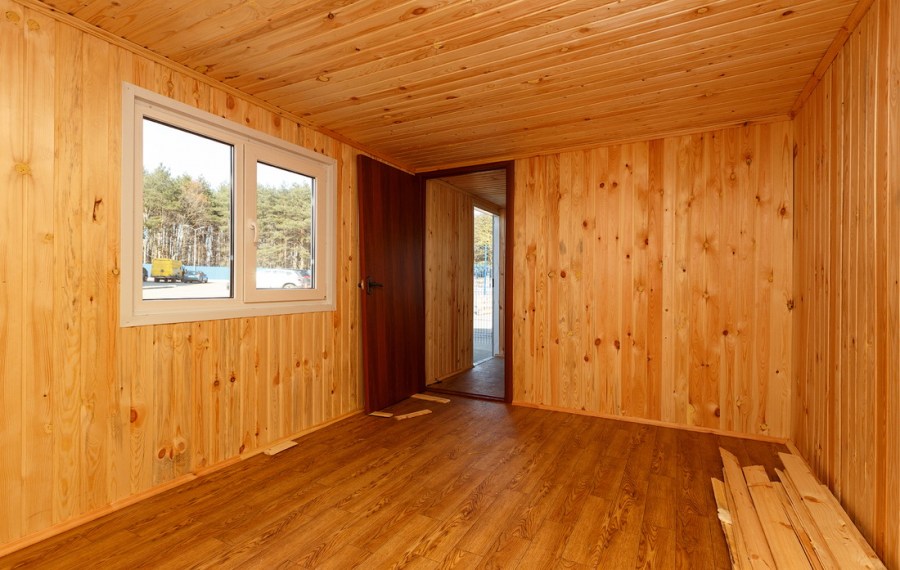 Внутри бытовка облагораживается любым имеющимся материалом (фанерой, ламинатом и так далее). Именно перед внутренними работами проводится прокладка электросетей (кабелей в гофре), а также выполняется утепление по аналогии с полом.