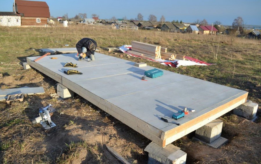 Сначала располагают деревянные брусья по периметру будущей постройки и обязательно по центру для укрепления конструкции.