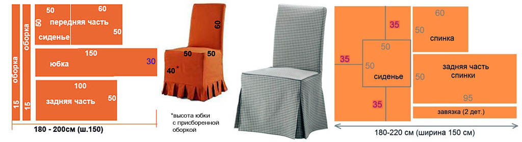 Если нежелательна юбка метущая, то ее высоту (соотв. размеры выделены цветом) уменьшают на 2-10 см. В таком случае раскрой получится экономнее, т.к. выкройки для пар стульев возможно будет разместить на одном отрезе зеркально отраженными по горизонтали.
