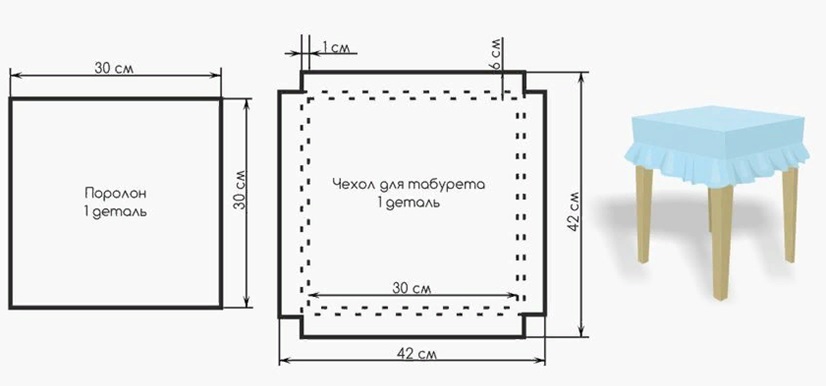 Перед тем, как сшить чехол на табурет на резинке, необходимо измерить поверхность изделия и перенести данные на картонку. Ее следует приложить к наполнителю и вырезать из него деталь подходящего размера. К ткани аналогичным образом прикладывается картонный элемент, однако вырезается кусок с запасом 7–8 см (в зависимости от толщины наполнителя). Когда все детали подготовлены, можно начинать процесс соединения мебельной накидки.