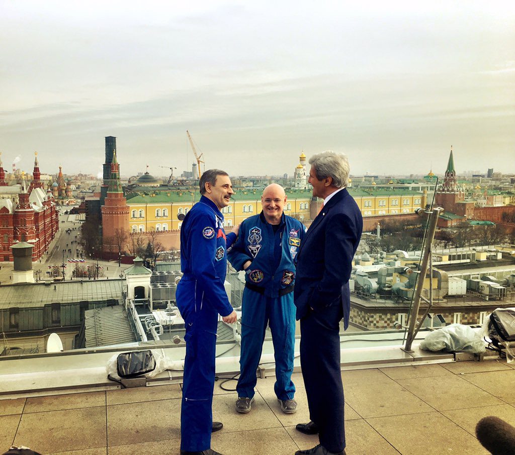 Потому что госсекретарь, прилетая в Москву, находит время встретиться и пообщаться с только что вернувшимися на Землю Скоттом и Михаилом.
