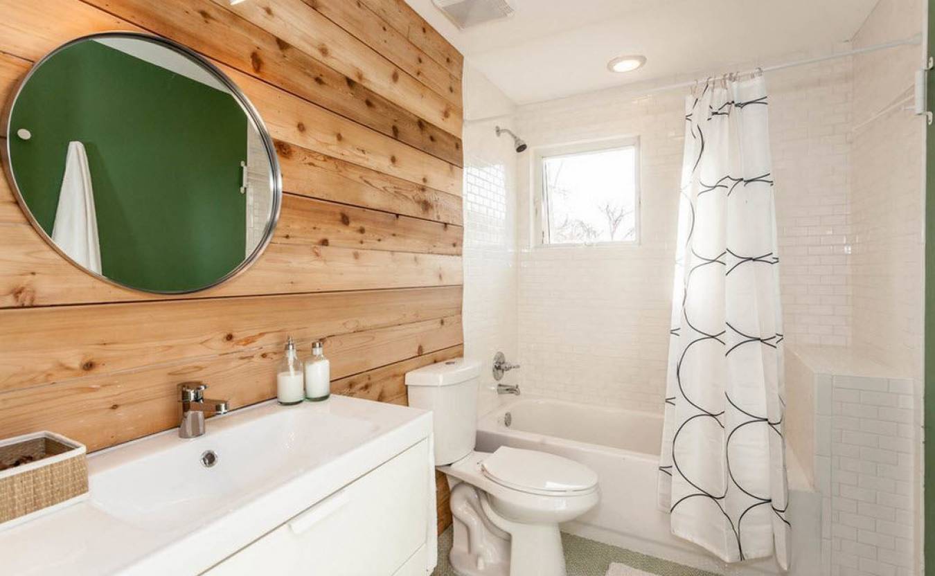Облицовка ванной комнаты древесиной – дорогостоящий процесс, так как долгое воздействие влаги могут выдержать только элитные породы дерева (дуб, ясень, бразильский бук). В сухих зонах использование натурального материала допустимо, но требует тщательной обработки морилкой и лаком.