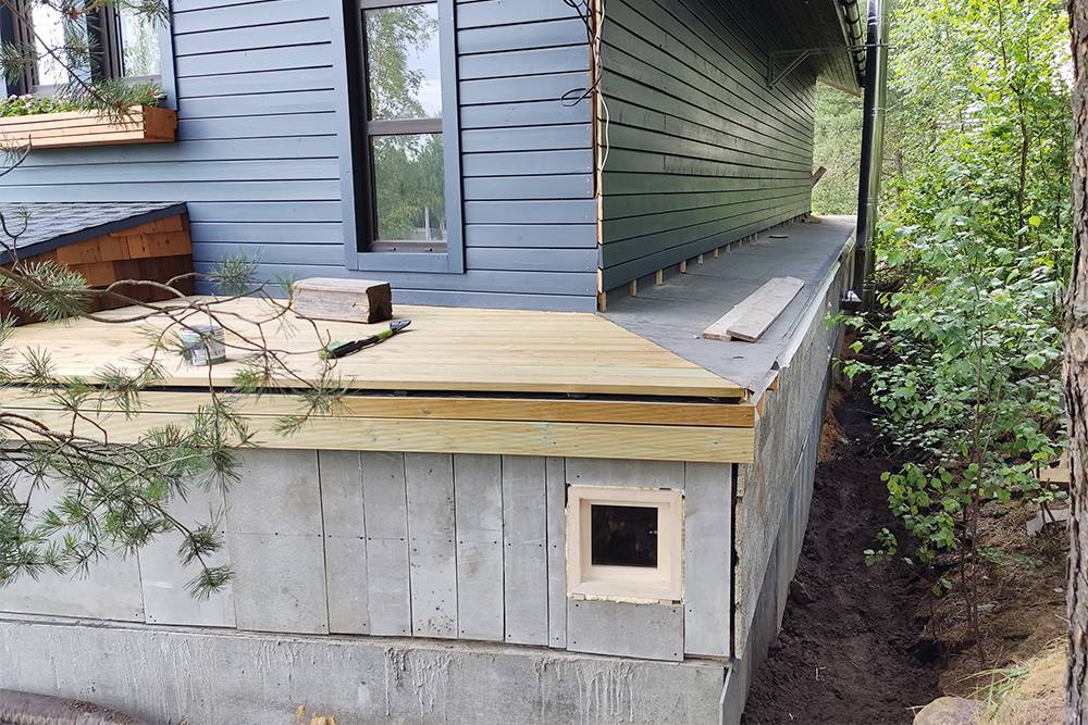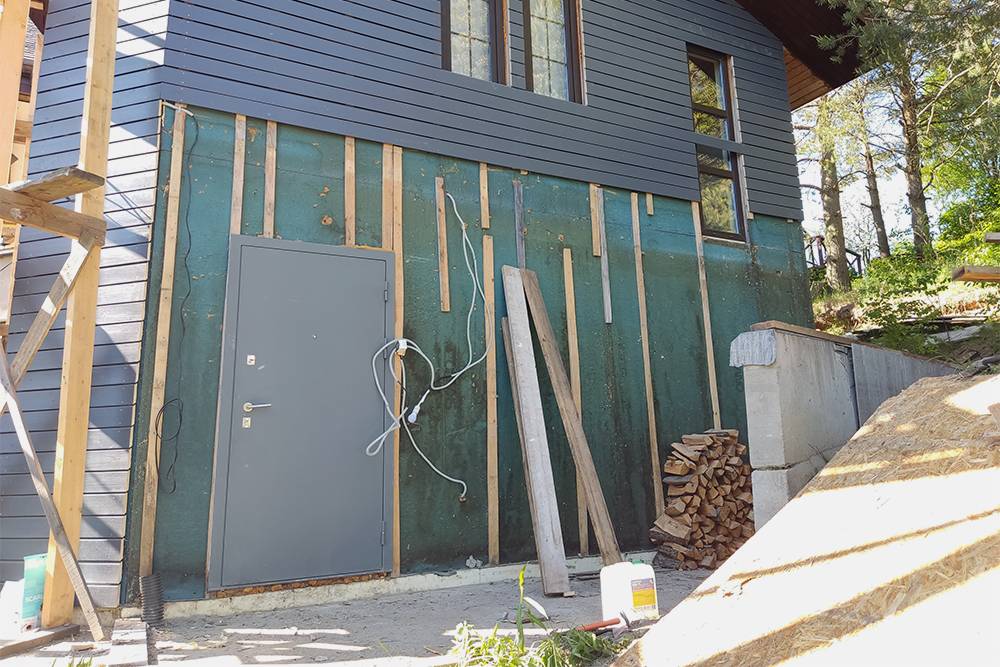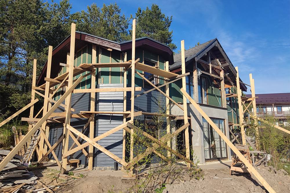 Сначала рабочие установили леса и начали демонтировать серые фасадные плиты. Также сняли направляющие, покрыли их антисептиком и закрепили саморезами на место. Антисептик использовали ХМ-11 из «Петровича», саморезы — оцинкованные 6 × 90 мм.