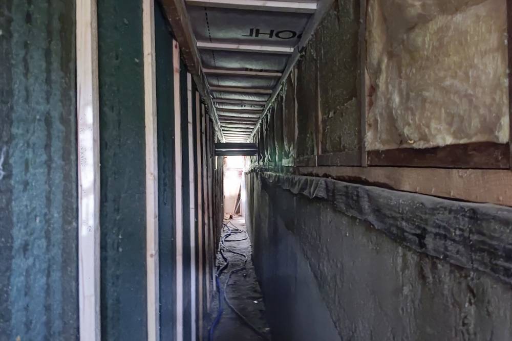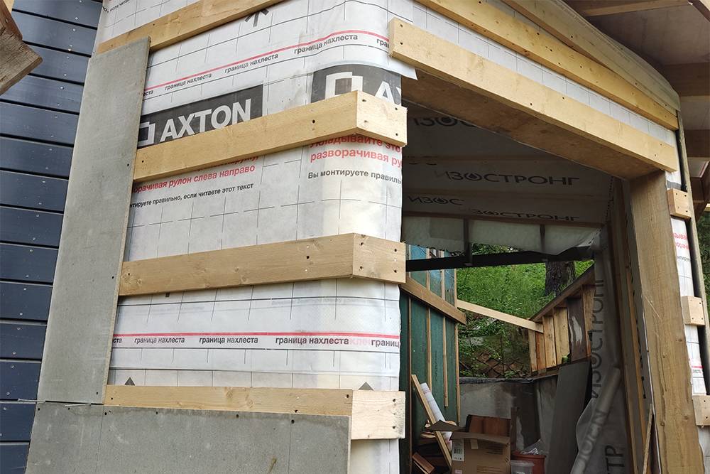 - Следующим шагом после гидроизоляции выступает крепление полиэтиленовой клеенки, защищающей стены от ветра.