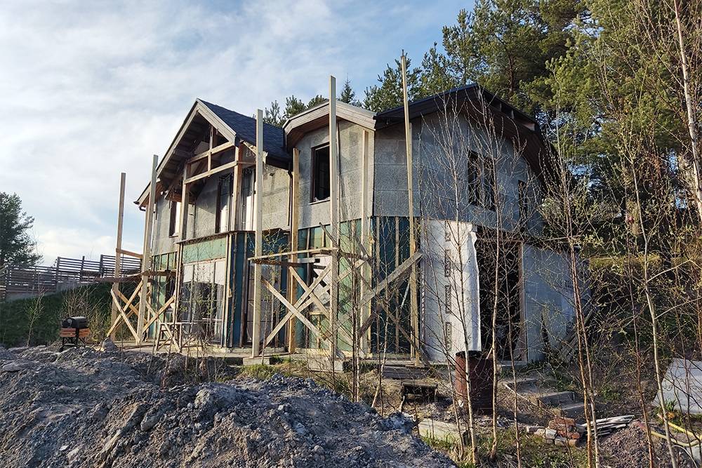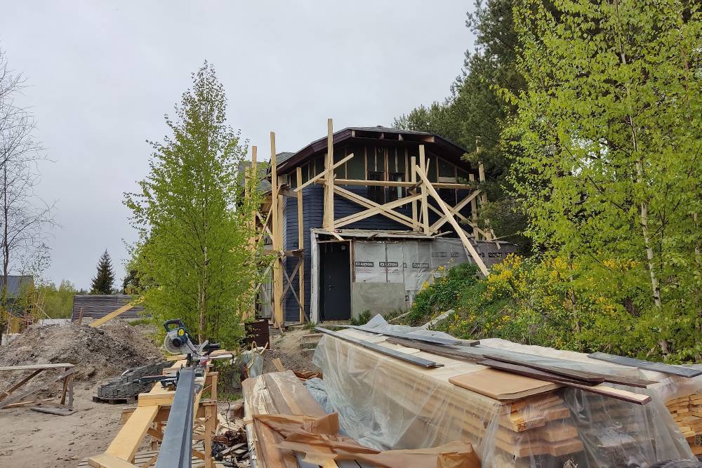 Работы с планкеном делали в два этапа: сначала обшили лицевую и боковые стороны дома, на это ушло около десяти дней. А заднюю стенку обшили за два дня, но в самом конце, после возведения пристройки. Такая последовательность работ позволила не делать леса вдоль задней стены, поскольку рабочие могли работать с крыши пристройки.
