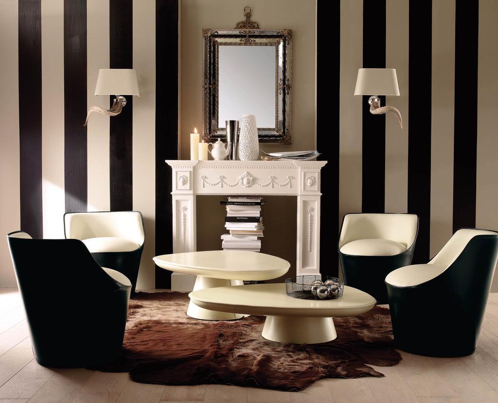 Черно-белые кресло и белые журнальные столы в интерьере гостиной