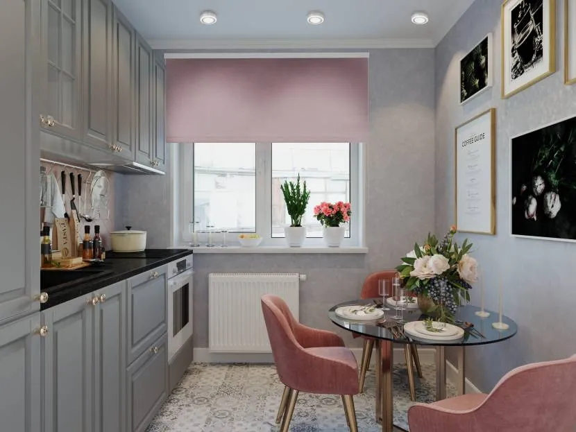 - А что до штор, гардины или жалюзи в кухне? Оформление окна при довольно ярких оттенках отделки также могут быть серыми.