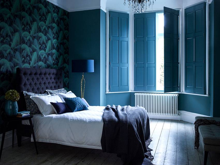 Спальня получается просторной, воздушной, а теплый коричневый уравновешивает холодный голубой. Если помещение небольшое, стоит использовать теплые оттенки: бирюзовый, серо-голубой. Не переусердствуйте с орнаментами: если обои однотонные – можно использовать пестрый текстиль, но на фоне яркой акцентной стены лучше смотрятся однотонные ткани. Третьим цветом можно выбрать белый, серый или бежевый.