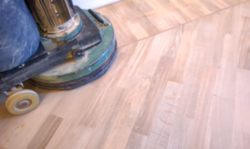 - убирают шероховатости, образовавшиеся в результате подъема древесных волокон, путем тщательного и аккуратного шлифования поверхностного слоя. Для повышения производительности процесса используют шлифовальную машину. После завершения работ напольную поверхность тщательно обеспыливают;