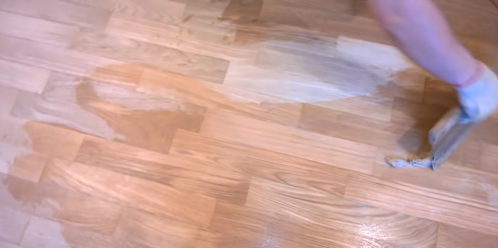 Наносят готовое средство на весь паркетный пол тонким слоем, используя для этого резиновый шпатель. С ним легко и просто работать по деревянным поверхностям. Когда раствор полностью высохнет, можно выполнить имитацию соединения планок путем применения острого шила и линейки.