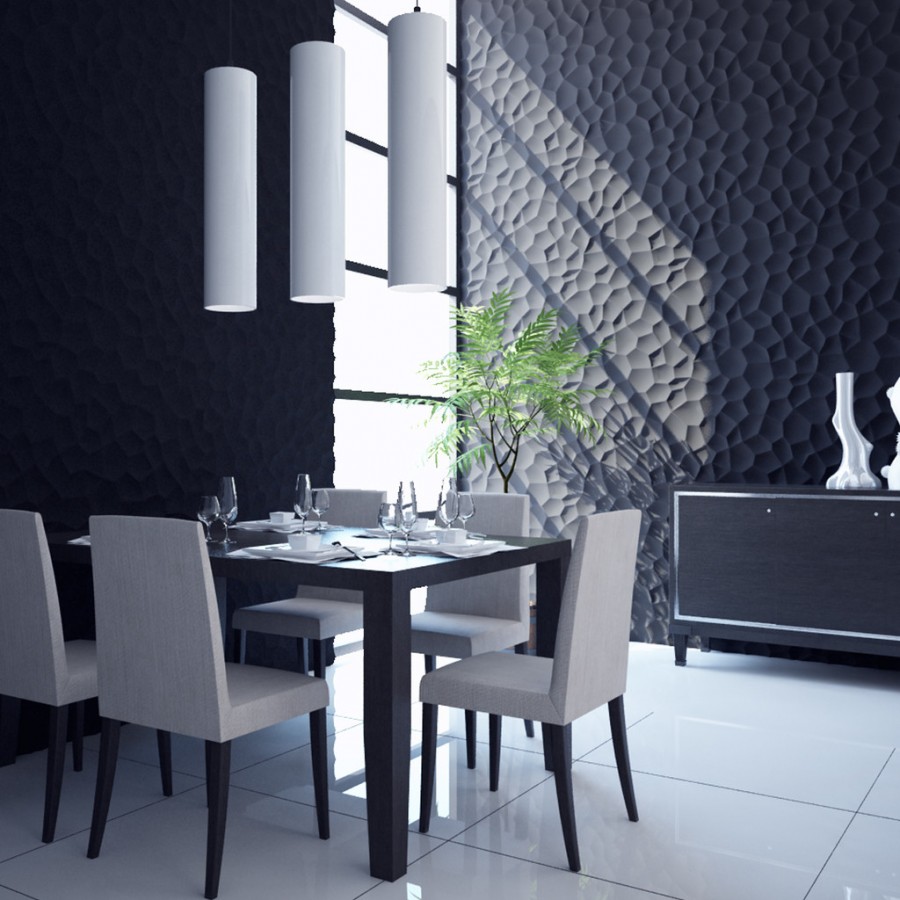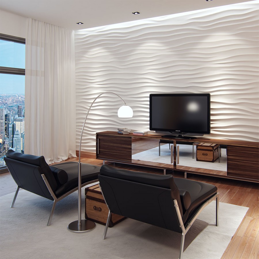 Стена с трехмерными панелями в таком случае заполнит возникшую «пустоту» в восприятии помещения и сделает лаконичный дизайн интересным и ярким. Усилить ее эффектность можно при помощи грамотного цветового решения и освещения
