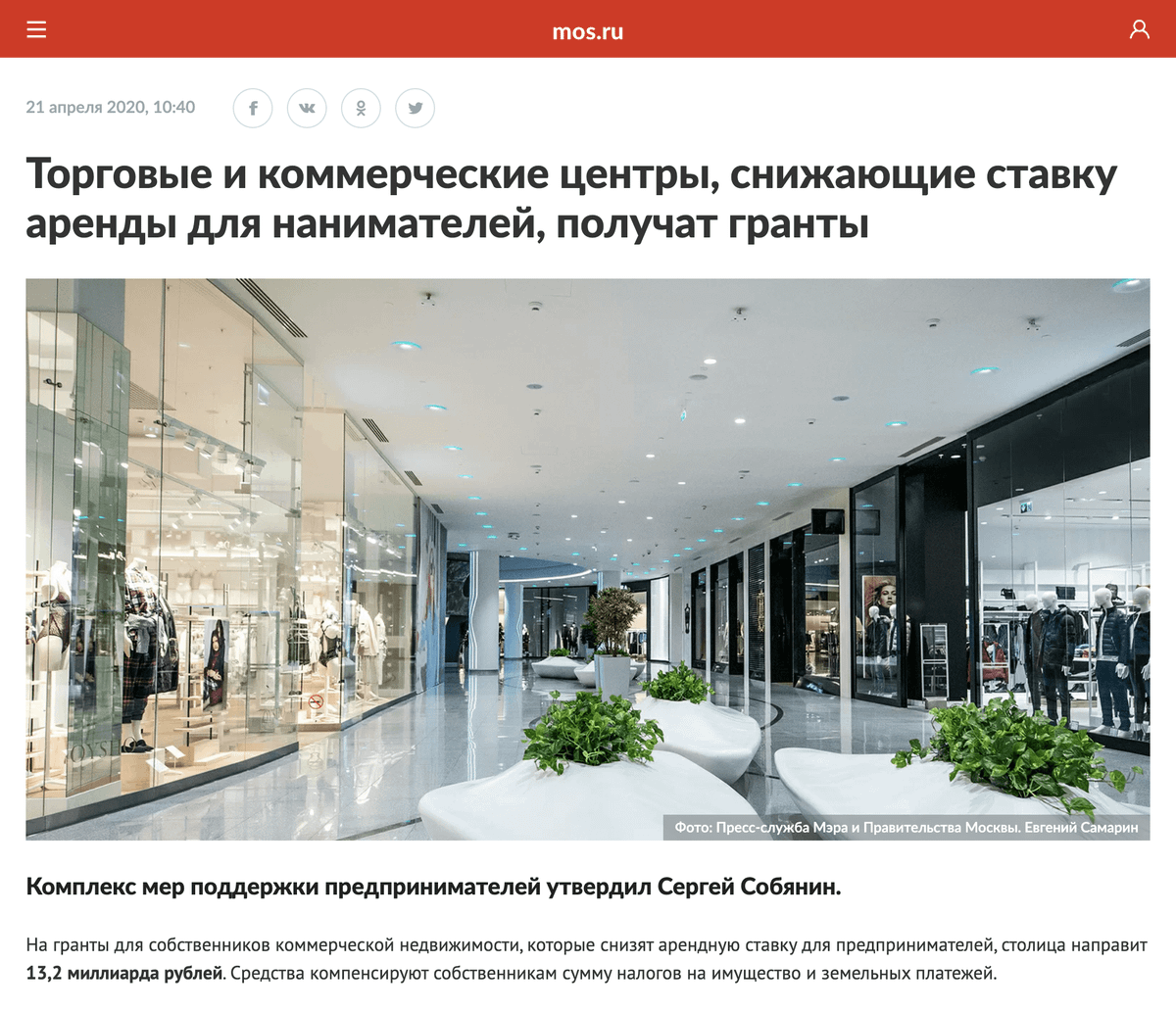 Правительство Москвы выделило 13,2 млрд рублей на поддержку тех арендодателей, которые снизят платежи для пострадавших от пандемии арендаторов