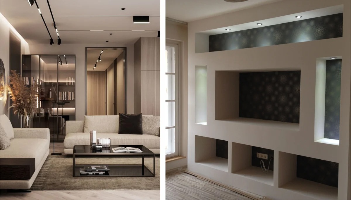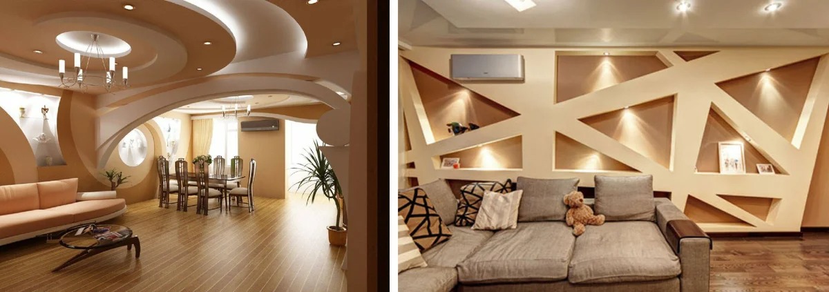 В начале двухтысячных большой популярностью при оформлении интерьера пользовались различные конструкции, декоративные перегородки и ниши из гипсокартона, пример которых я прикрепил ниже.