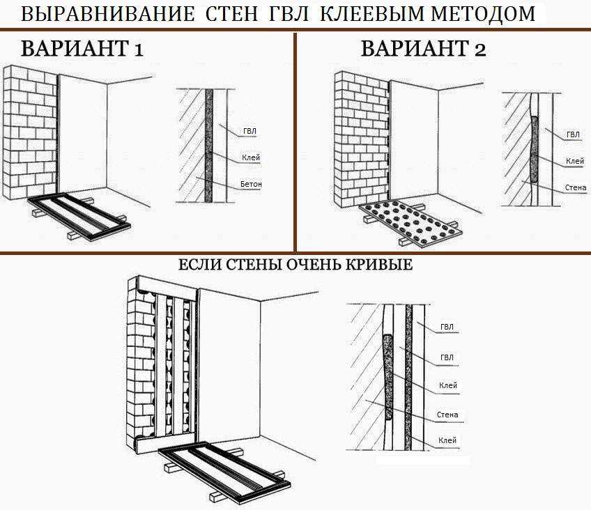ГВЛ крепится к стенам специальным клеем. Методы крепежа: