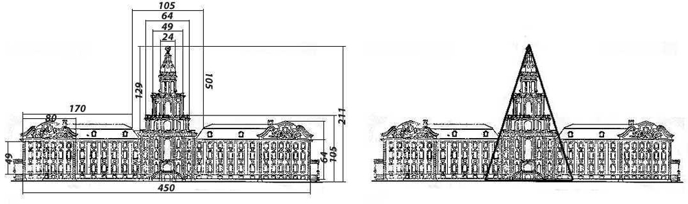 Кунсткамера была построена ещё в 1718 году, руководил строительством немецкий архитектор Георг Маттарнови. Она представляет собой 2 корпуса по 3 этажа, между ними возведена куполообразная многоярусная конструкция в виде башни.Золотое сечение в соотношении сторон можно наблюдать в длине корпусов и в высотах разных уровней.