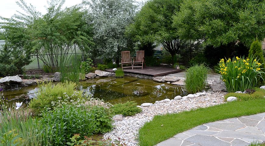- В таком уголке приживутся тенелюбивые и влаголюбивые растения, рядышком можно поставить лавочку с видом на зеркало воды